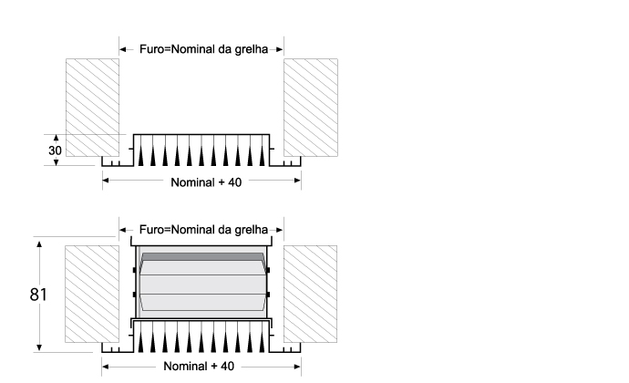 GLP Grelha linear de parede e teto com aro. Lâminas fixas a 0° ou 15°. GLP-0 Modelo com registo. |